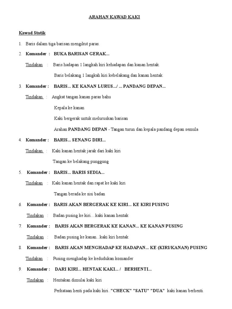 Text of arahan kawad kaki pengakap. Arahan pergerakan yang mesti dilakukan oleh skuad, dengan nyaring dan tajam:
